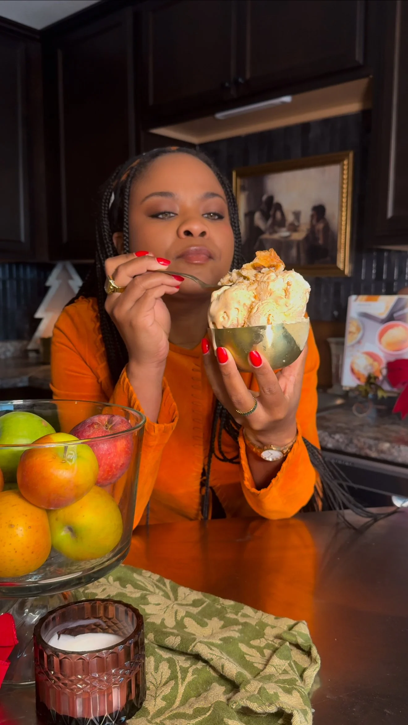 If you want to take it to the next level, I highly recommend adding pie crust pieces, candied walnuts, and a dollop of maple whipped cream—just like I did on the show. You can find those recipes, along with the full sweet potato pie ice cream version, in my cookbook Mostly Homemade.